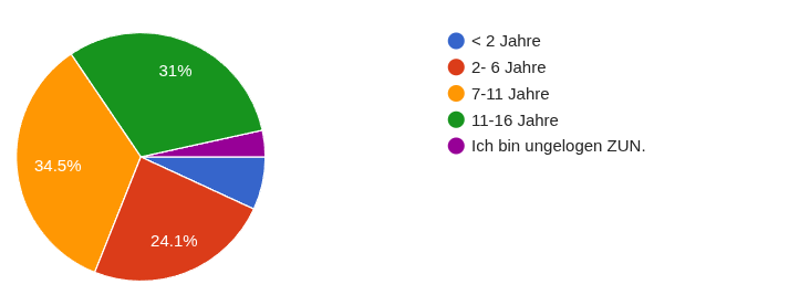 Wie erwartet ist ein Großteil der aktiven Mitgliedschaft aus den letzten fünf Jahren. Allerdings sind auch noch einige (gut ein Drittel) alte Hasen aus den früheren Interationen der Community aktiv. Tatsächlich gab es Rückmeldung aus allen fünf Generationen.